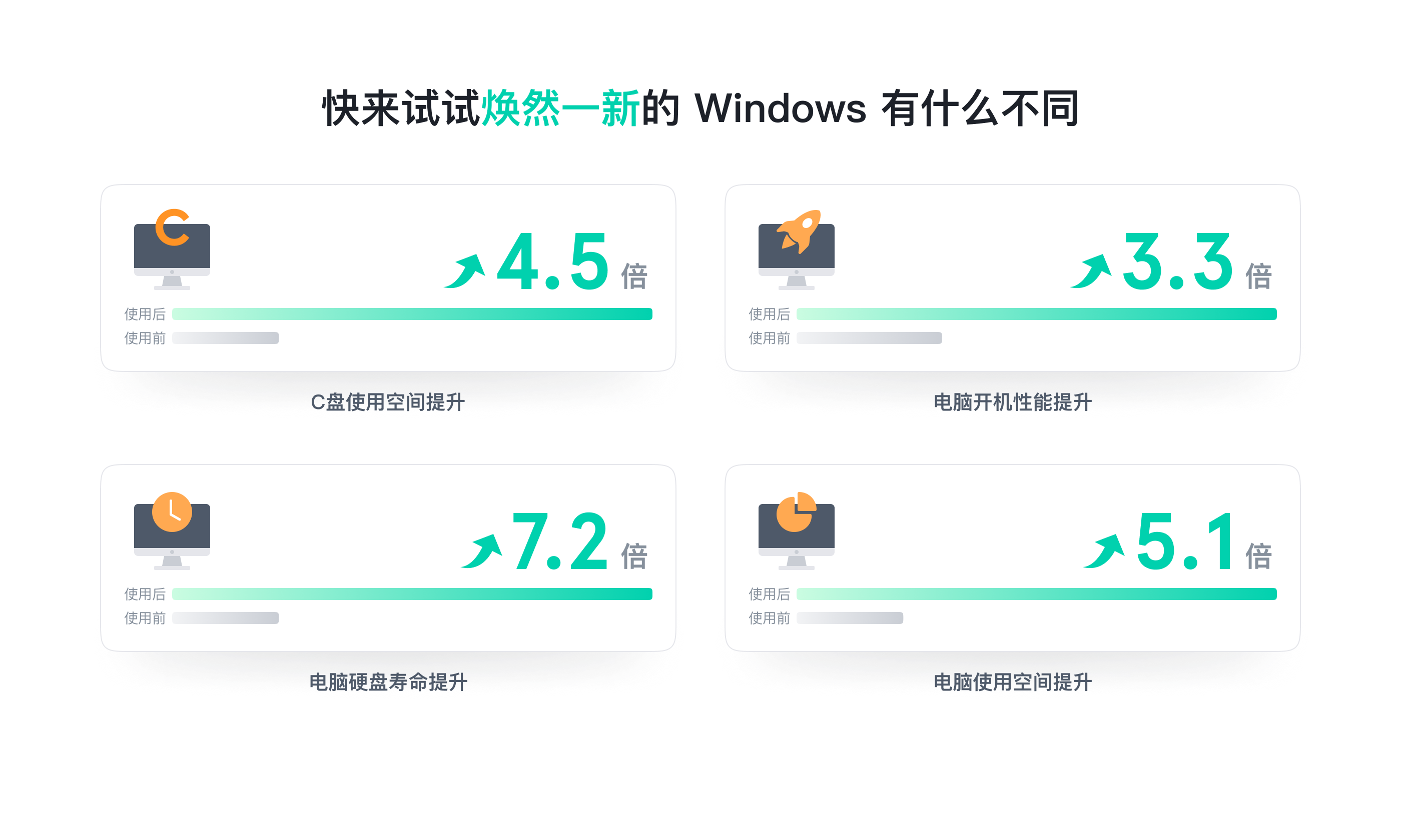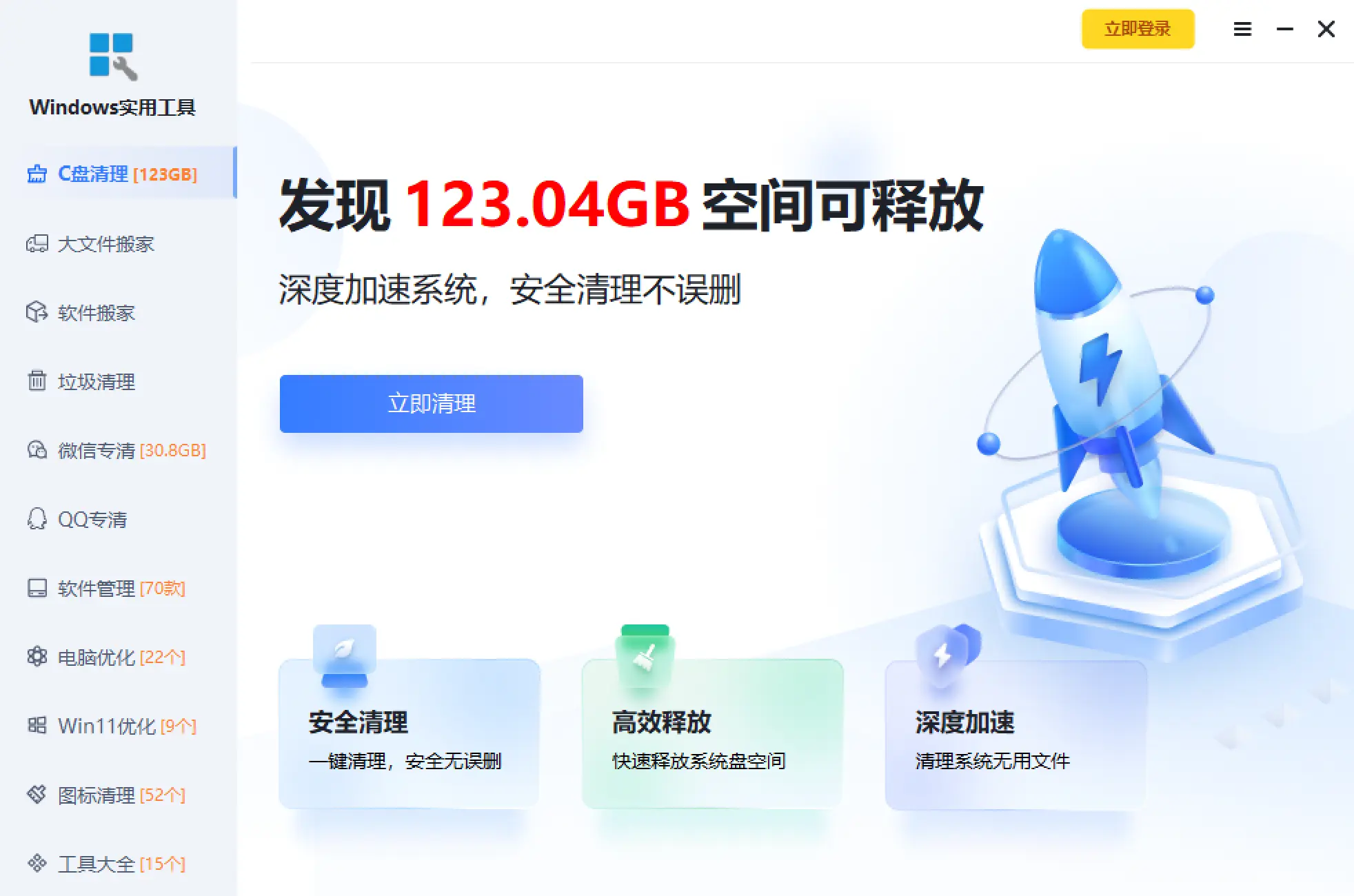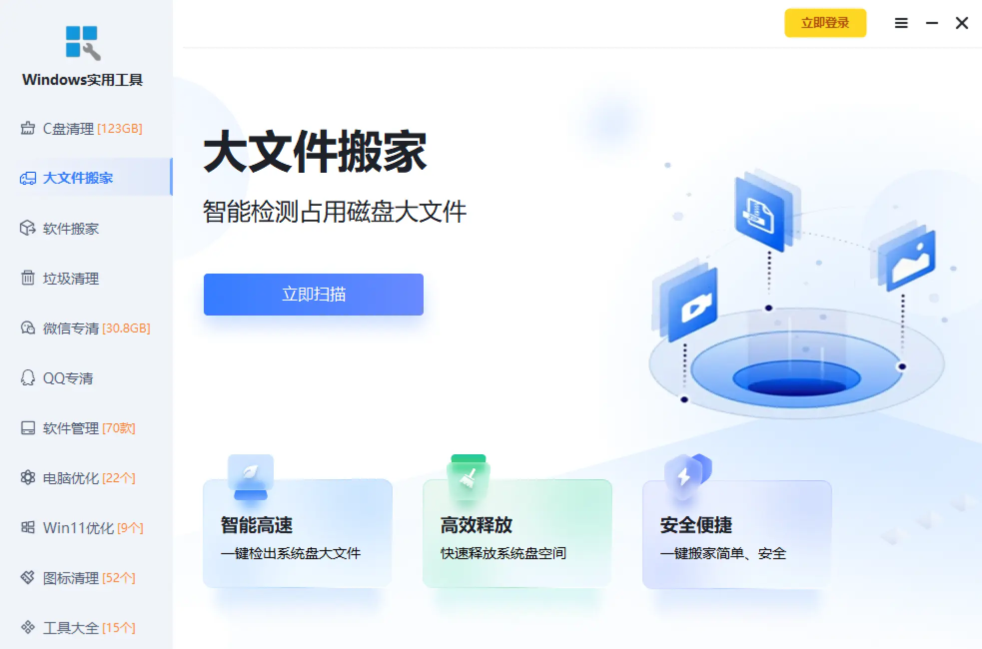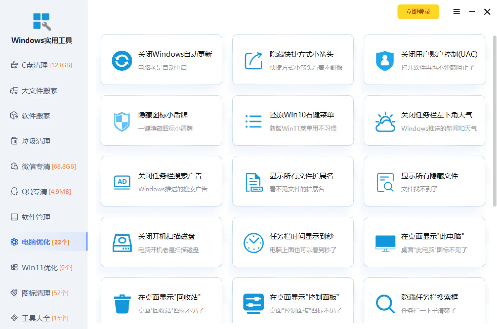 一键清理C盘不误删,立即释放超大C盘空间! 支持C盘瘦身、系统盘扩容、电脑优化、大文件搬家、软件管理、桌面设置、win10/win11优化、图标清理、禁用Windows自动更新、禁用开机磁盘扫描、去除桌面图标小箭头、在桌面显示此电脑、微信多开账号等功能。还提供大量快捷实用小工具!彻底解决电脑卡顿、空间满的问题,让您的电脑秒变新机!