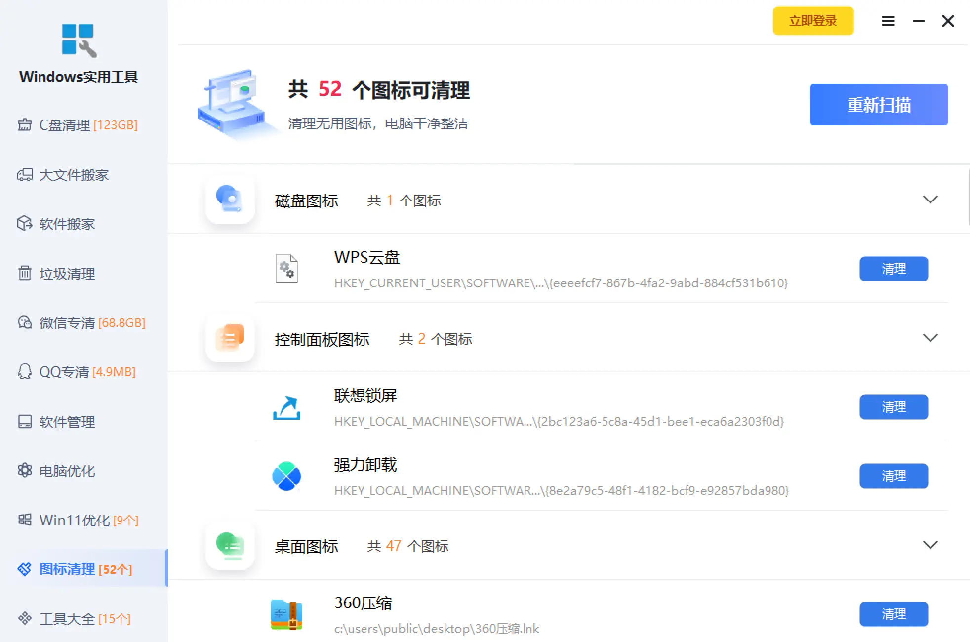 全面扫描电脑不常用图标,只能分类软件,清理更方便。